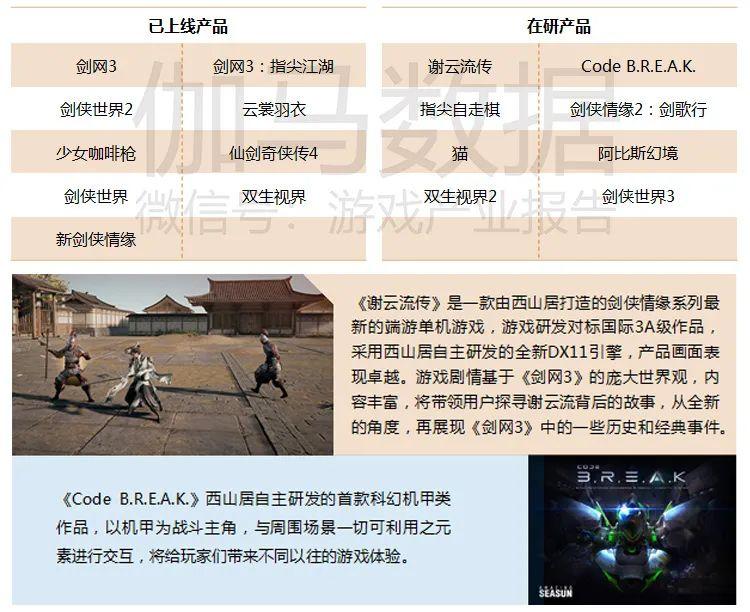 除了已发行产品外,西山居目前仍然有《谢云流传》《Code B.R.E.A.K.》等对标国际3A大作的在研项目。《谢云流传》是西山居深耕武侠题材,集多年技术积累与研发经验的重度3A端游作品。《Code B.R.E.A.K.》则是面向机甲题材蓝海市场的一款国际化游戏产品。
