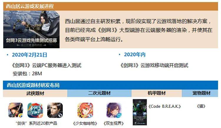《剑网 3》 云游戏于去年开启了西山居内部测试,今年2月份正式面向玩家开启PC端云游戏测试,《剑网3》云游戏移动端同样将于2020年内落地测试。云游戏可以打破硬件的限制,让高品质的重度端游呈现在更多的设备上,未来即将开放的移动端云游戏,会对传统手游市场造成较大的冲击。作为国内云游戏首发梯队,云游戏时代西山居有望凭借着高品质重度端游的云游戏化,揽下更大份额的移动端用户。同时,多品类并行的自研产品精品化策略也有助于在各细分领域中覆盖更聚深度的垂直用户,未来西山居的用户增长潜力巨大。以《剑网3》为代表产品的“剑侠”系列是西山居打造武侠题材的核心系列产品,目前已有近20部同系列产品。除了布局“剑侠”系列题材产品,西山居在二次元题材、机甲题材、宠物题材等多个领域未来也有布局。在产品研发及调优、多题材产品并行的优势下,未来西山居将有较大机会产出爆款新品。