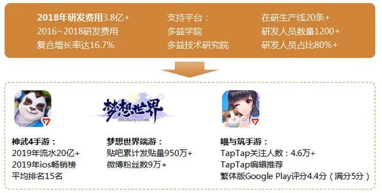 多益网络在研发投入产出比、产品表现等多项上评分居高。一方面,多益网络注重技术投入,2016-2018年研发费用占营业收入比重均超过16%,较高投入使多益网络获得包括专利信息、著作权等在内的超千项知识产权,助力其保持研发技术优势。另一方面,多益网络重视研发人才的培养与积累,目前,多益网络拥有超1200名研发人员,并建立自身员工培训体系,为产品的研发和维护稳定地输送人才,持续提升自身研发实力使多益网络新老产品获得用户认可。