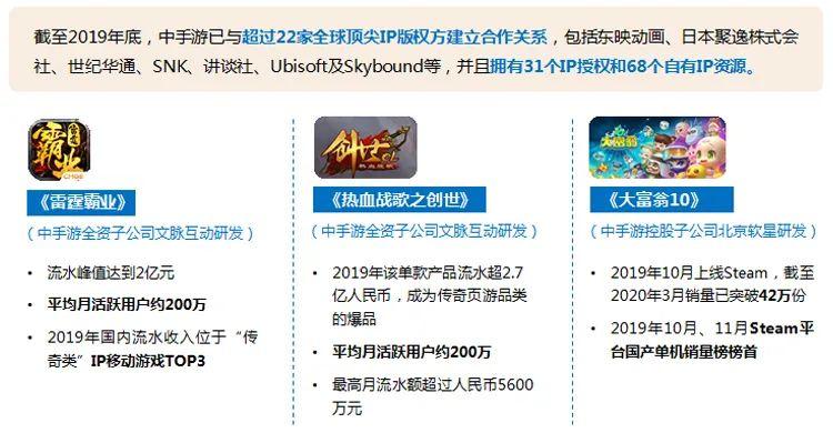 截至2019年底,中手游旗下的自有和获授权IP累计已达99个,近年来中手游加速研发布局以释放IP资源优势。在IP产品开发上,中手游通过自主研发与合作研发的形式拓展产品线,同时深入了解IP产品的研发流程。2018年底,中手游全资收购子公司的产品《雷霆霸业》正式上线,依托于产品质量与中手游的发行渠道优势,产品在2019年的较高流水表现为中手游带来了营业收入新高。
