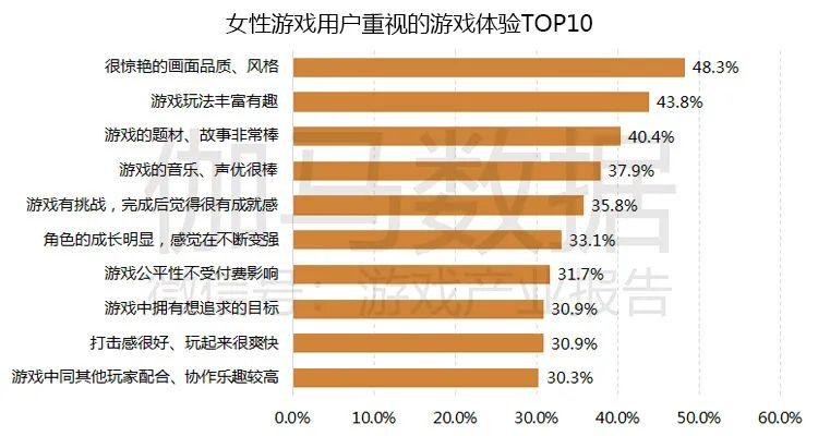 有意思的是,对于男女用户的调研发现,除了都特别重视“画面品质和风格”外,男女关注的点颇有不同。男性显然更重视“公平性”“竞技性”,最不在乎“音乐”,女性用户则更看重“有趣”和“故事好”。