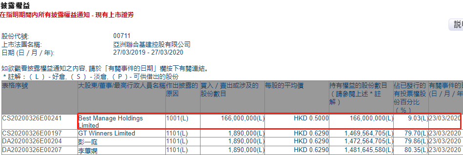 亚洲联合基建控股(00711.HK)获Best Manage Holdings首次买入1.66亿股