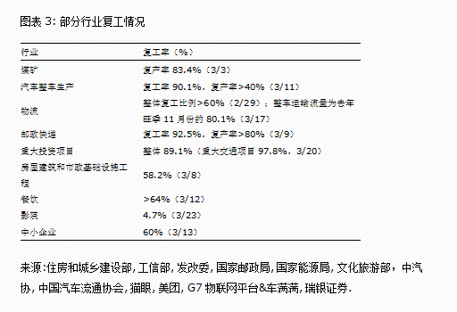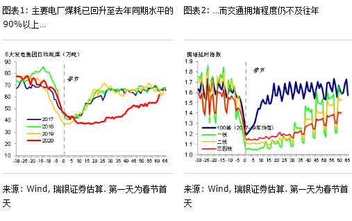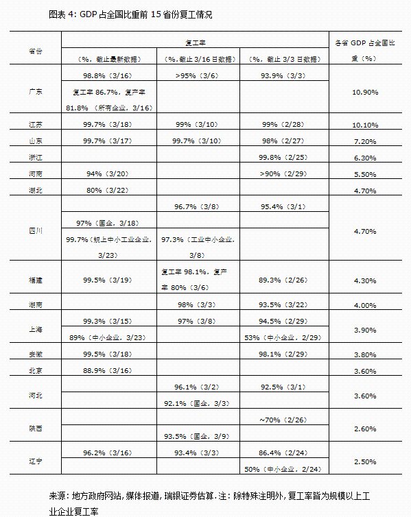 目前工业活动复工进展较快,部分行业或已接近常态... 我们的每日经济活动追踪显示本周主要电厂日均煤耗进一步上行,目前已回升至往年同期的90%以上(图表1),侧面反映工业活动可能已恢复至接近常态。与之相对,工业企业的复工率也已回升至较高水平;而产能利用率也在提升、尤其是重工业,不过部分行业仍不高(图表3&4)。最新数据显示,全国平均高炉开工率已略超2018-19年同期水平,但电弧炉开工率仍处低位。另一方面,尽管大部分整车厂已恢复了生产,但其产能还远未恢复到正常水平。此外,30个大中城市房地产日均销售已回升至正常水平的60%以上。瑞银Evidence Lab中国即时预报显示港口活动已基本恢复至常态。