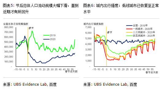 城际的人口流动逐步恢复。从全国层面来看,春节后城际和省际人口流动一直较低迷(图表5),直到节后第23天才开始逐步改善(216日)。与之类似,瑞银“把脉消费”问卷调查中,受访者春节假期在法定7天的基础上也平均额外延长了12天。经过一个多月的恢复后,目前全国总体的每日人口流动规模已恢复至去年同期60%-70%的水平。这可能意味着:1)农民工逐渐返城或者跨区域流动;2)出城商务和休闲旅行有所回暖。不过2020年与2019年相比,很显然过去两个月的人口流动规模要远低于去年同期的水平。