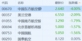 港A两市航空股下跌,港股方面,中国东方航空股份跌4.00%、中国国航、中国南方航空均跌超1.5%。