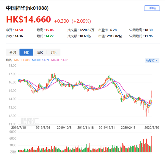 中国神华AH股逆势走强 拟提高2019-21年度现金分红比例