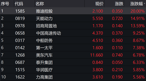 从港股通个股涨跌幅表现看,今日港股通标的中涨幅前五的个股分别是:雅迪控股(1585.HK)、天能动力(0819.HK)、招商局置地(0978.HK)、中国高速传动(0658.HK)、中船防务(0317.HK)。
