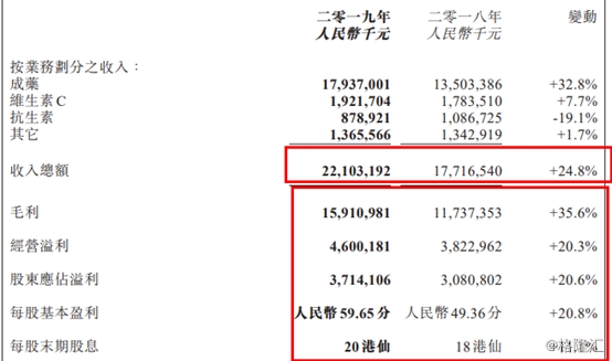 细看公司的各项业务板块,颇具看点。公司的业务构成,主要包括由创新药和普药组成的成药、维生素C、抗生素及其他,其中成药的收入增长强劲,2019年录得收入179.37亿元,同比增长32.8%;维生素C在2019年录得收入19.21亿元,同比增长7.7%。