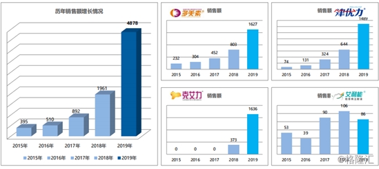2019年,抗肿瘤领域药品表现亮眼,营业收入48.78亿元,同比增长148%,2015年至2019年复合增长高达87%,成为石药集团业绩的重要增长点,核心产品包括多美素、津优力、克艾力、艾利能和诺利宁等。