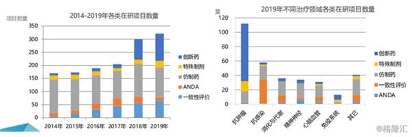 图表五:2014-2019年公司在研项目数(左)与2019年治疗领域(右)