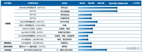 公司在研大分子创新药50余项,13项处于临床研究阶段,其中3项注册临床,40余项处于临床前研究阶段。