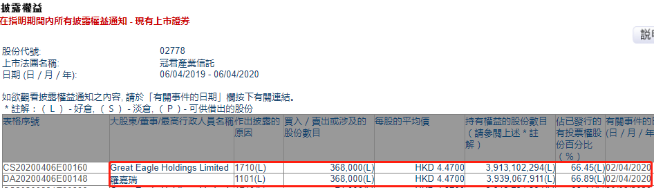 格隆汇APP获悉,根据联交所最新权益披露资料显示,2020年4月2日,冠君产业信托(02778.HK)获主席及非执行董事罗嘉瑞在场内以每基金单位均价4.47港元增持36.8万个基金单位,涉资约164.50万港元。增持后,罗嘉瑞最新持有约39.3907亿个基金单位,持基金单位比例由66.88%升至66.89%。