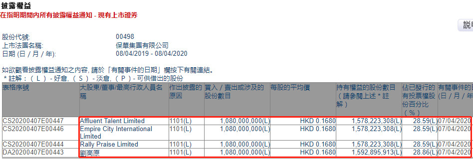 格隆汇APP获悉,根据联交所最新权益披露资料显示,2020年4月7日,保华集团(00498.HK)获执行董事、主席兼总裁刘高原透过Rally Praise Limited在场外以每股均价0.168港元增持10.8亿股,涉资约1.81亿港元。增持后,刘高原最新持股数目约为15.93亿股,持股比例由9.29%升至28.86%。