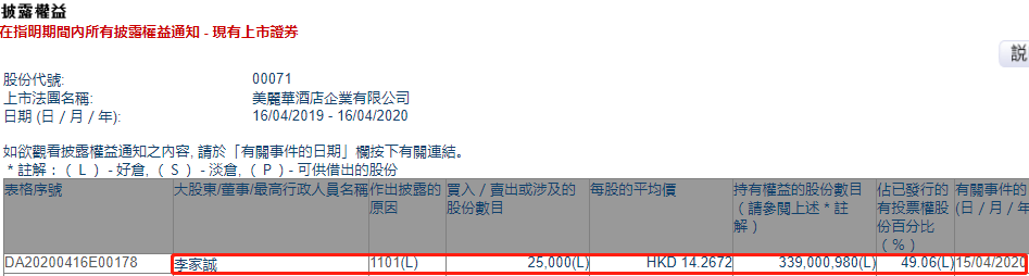 格隆汇APP获悉,根据联交所最新权益披露资料显示,2020年4月15日,美丽华酒店(00071.HK)获执行董事、董事长兼行政总裁李家诚在场内以每股均价14.2672港元增持2.5万股,涉资约35.67万港元。增持后,李家诚持有公司股份约3.39亿股,最新持股比例为49.06%。