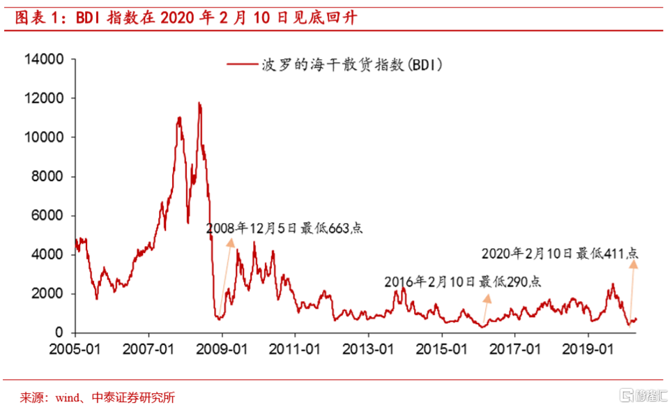 波罗的海干散货指数2月10日触底回升,全球经济逐步复苏。BDI指数是散装原物料如钢材、纸浆、谷物、煤、矿砂、磷矿石、铝矾土等的运费指数,散装航运业营运状况与全球经济景气荣枯息息相关,故波罗的海指数可视为经济领先指标。2020年1月23日我国武汉开始封城,全国居家隔离生产活动停滞,2月4日疫情迎来拐点每日新增数开始回落,随后2月10日春节假期结束开始逐步复工复产。2020年2月10日BDI指数达到最低点411点后开始止跌回升,说明全球经济从2月10日中国复工复产以来已经开始逐步复苏。从BDI数值看,2020年2月10日低点441点虽然低于2008年金融危机低点663点不过此次BDI从高点下跌幅度远小于金融危机时期下跌幅度。2月10日BDI高于2016年初低点290点。表明今年2月初全球经济最差时期仍好于2016年初时的全球经济。