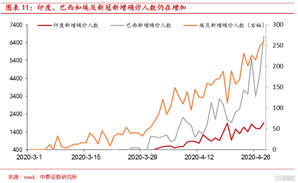 如果印度非洲南美疫情大范围爆发,对全球经济影响有限。当前印度、南美的巴西和非洲的埃及等国家由于人口众多且医疗条件落后,疫情仍然在加剧扩散,市场担忧未来有大范围爆发的可能。如果爆发是否会对全球经济有较大冲击?我们认为不会。2018年印度、非洲、南美洲GDP分别为2.7万亿、2.3万亿和3.7万亿美元,合计8.7万亿,仅占全球GDP的10%。而美欧中日韩GDP合计占全球GDP的70%,即使印度南美非洲疫情爆发,由于其在全球经济占比较低,对全球经济影响有限。