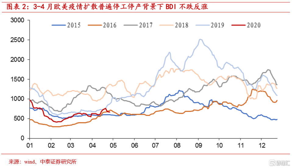 3-4月欧美疫情扩散普遍停工停产背景下BDI不跌反涨。3月以来疫情开始在欧美快速扩散,3月10日欧美国家陆续开始封城,市场普遍担忧欧美国家需求大幅下滑对全球经济形成较大冲击。但我们发现3-4月BDI指数仍然震荡向上,数据并未如市场所担忧的那样悲观。考虑到季节因素可能的影响,我们统计了2015年以来同期BDI指数,发现2020年3月以后BDI指数高于2015、2016年。从春节后BDI向上斜率看,2020年比2015/2018/2019年同期向上回升更快。我们认为并非是季节性因素导致BDI出现回升,全球采取一系列宽松政策以及中国经济持续回升,或是BDI上涨的主要原因。