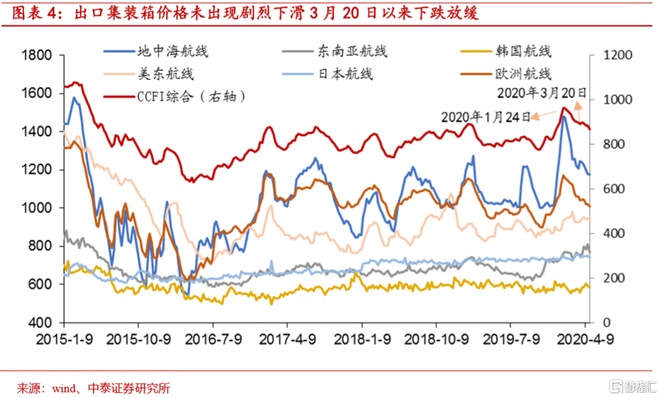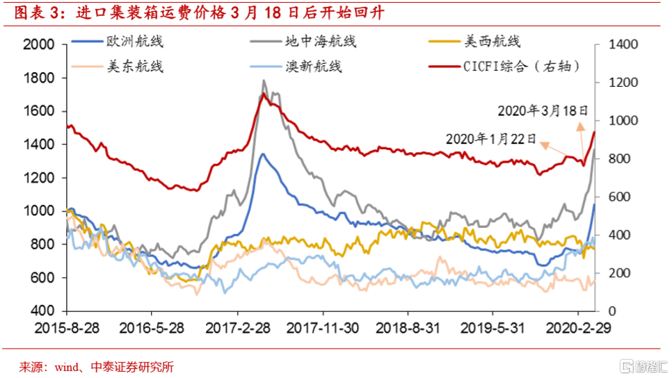 疫情对我国供应链上游原料端无明显冲击。市场担忧全球疫情扩散会导致我国供应链原料端出现断供风险。若真如此,我国进口将出现大幅下滑带动集装箱运价下跌。但从进口集装箱运价数据看,3月18日以来欧美疫情严重时期我国进口集装箱运价在持续上涨,原因或是3月18日后我国经济持续向好带动进口需求回升,同时外国对我国出口并未因疫情冲击减少反而有所增加。从不同航线看,欧洲和地中海航线运费涨价较多,澳新、美西、美东航线运费价格变化不大,表明我国从欧洲和地中海区域进口增加较多。从进口集装箱运价上涨看,疫情对我国供应链上游原料端无明显冲击。