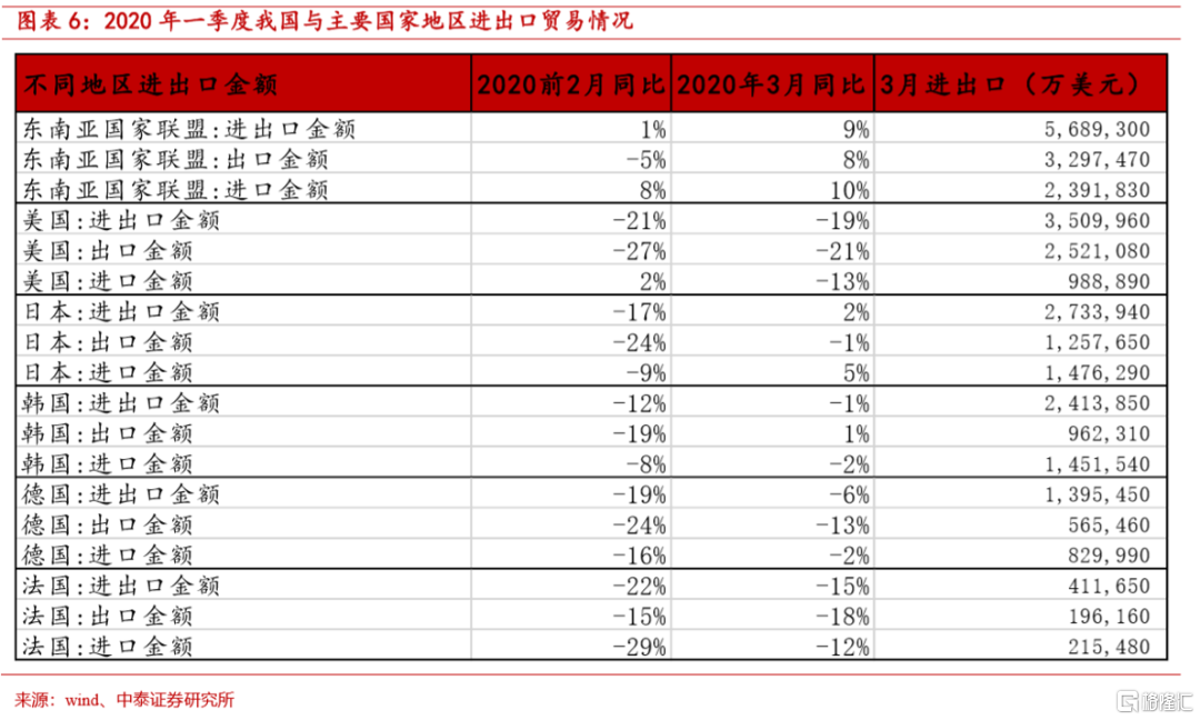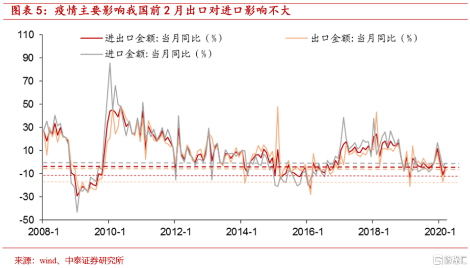 我国进出口数据显示疫情主要影响我国前两月出口,3月出口明显改善,疫情对我国进口影响不大。前2月出口金额出现较大回落同比下降达17.11%,不过个别月份进口大幅下滑在近年也曾出现如2016年初,下降幅度小于金融危机时期,2009年有一半月份出口同比下降超20%。2020年3月以来国内大力推进复工复产,出口迎来明显改善3月出口同比下降幅度收窄至6.6%。疫情对我国进口影响较小,前两月进口同比下降3.89%,3月同比下降收窄至1%。从一季度进出口数据看,疫情主要影响我国外需,目前外需已开始转好,疫情对进口相关的内需影响不大。