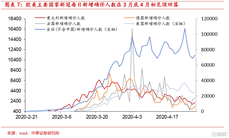 欧美主要国家新冠每日新增确诊人数在3月底4月初见顶回落。意大利于3月21日达到顶峰,德国3月25日达到顶峰,法国4月3日达到顶峰,美国4月4日达到顶峰,全球在4月3日达到顶峰,符合我们二季度策略报告预判全球疫情在3月底4月初迎来拐点。