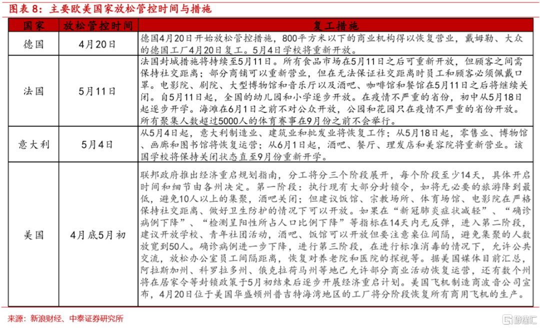 欧美国家4月底5月初将逐步复工复产,海外需求将逐步回升。随着欧美疫情向好趋势发展,4月底5月初主要欧美国家将开始复工复产。德国4月20日开始放松管控措施,戴姆勒、大众等车企开始复工。法国5月11日后部分商铺可以重新营业。意大利从5月4日起制造业、建筑业和批发业将恢复工作。美国联邦政府推出经济重启规划指南,复工将分三个阶段展开,每个阶段至少14天,逐步推动复工复产。预计4月底5月初美国各州陆续放松管控。随着欧美国家开始复工复产,预计海外需求将逐步回升。