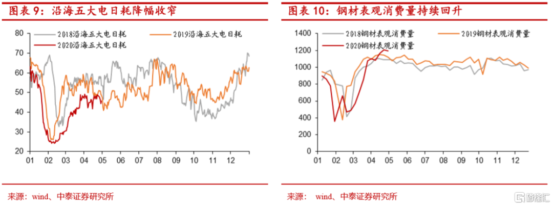 电厂日耗与钢材消费同比回暖,海外疫情扩散背景下国内经济延续复苏。虽然3月以来国外疫情持续扩散,国内经济仍延续复苏态势。沿海五大电厂日耗煤3月以来同比降幅持续收窄,4月中下旬已接近去年同期水平。钢材表观消费量3月以来同比降幅持续收窄,4月甚至已经超过去年同期水平。虽然部分行业仍受疫情影响,但总体看我国经济维持向好发展态势。