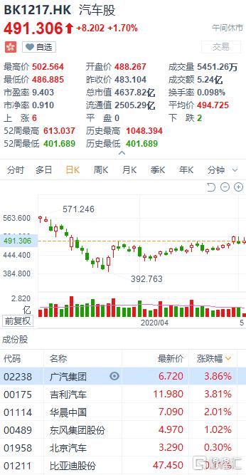 汽车股今日集体上涨。广汽集团、吉利汽车以近4%的涨幅领跑,华晨中国、东风集团股份、北京汽车、比亚迪股份纷纷飘红。