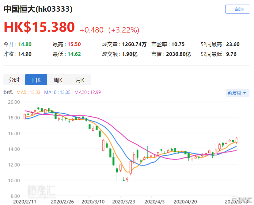 港股异动丨中国恒大(03333.HK)涨3.22% 5月以来耗资超2.24亿港元进行回购