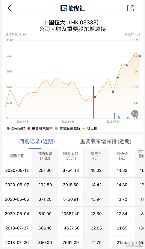 格隆汇5月13日丨中国恒大(03333.HK)涨3.22%,报15.38港元,股价刷新近2个月以来新高,总市值2037亿港元。据格隆汇APP数据显示,进入5月份以来,中国恒大已经进行了四次回购操作,总计耗资超2.24亿港元。