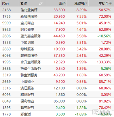 当日,资本市场物业板块也迎来热捧,多家物业公司股价表现突出,在利好消息刺激下的佳兆业美好更是成为领头羊,当日收涨8.29%,股价创下上市以来新高。