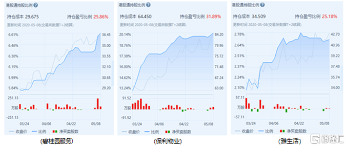 板块热络的背后与南下资金的助力不无关系,今年来多家物业公司港股通持股比例呈现快速上升之势,而这其中3 月份新进入港股通的保利物业(6049.HK)和雅生活服务(3319.HK)最为典型。截止5月12日,保利物业港股通持股量达到3089.5万股,占港股总股数20.2%;雅生活服务港股通持股量达到1171.1万股,占港股总股数2.7%。而随着后续包括新城悦服务(1755.HK)、永升生活服务(1995.HK)等多家潜在港股通标的获纳入,资金对整个板块的增持效应还将持续。