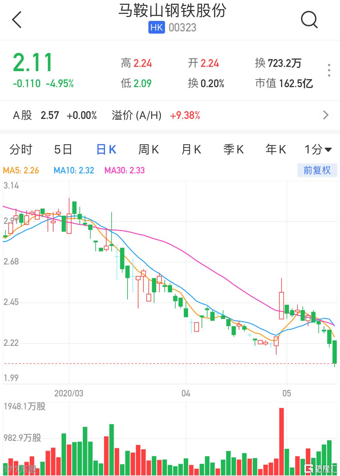港股异动丨马钢股份(0323.HK)跌5%创近3年新低