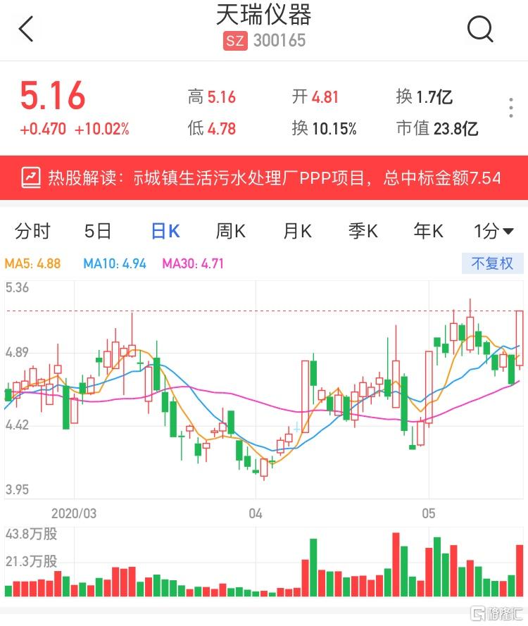A股异动 | 天瑞仪器(300165.SZ)涨停 联合体中标城镇生活污水处理厂PPP项目