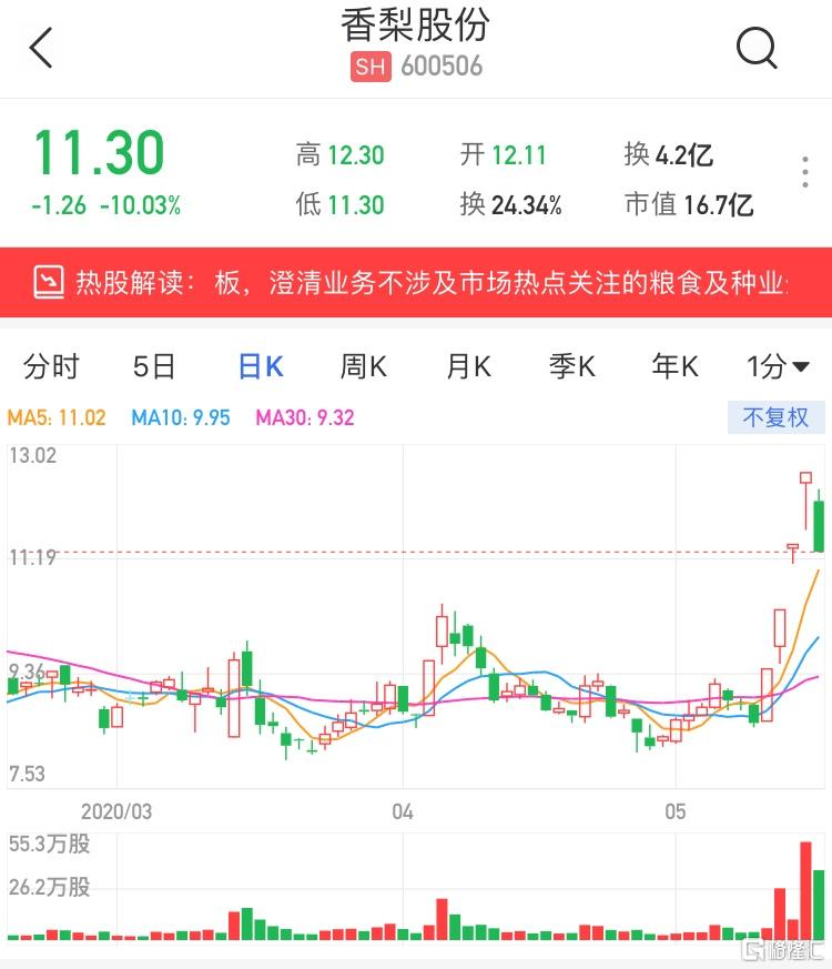 格隆汇5月21日丨此前连续四个交易日涨停的香梨股份(600506.SH)今日跌停,现报11.3元,暂成交4.2亿元,最新总市值16亿元。香梨股份昨晚发布股票交易风险提示公告称,目前公司主营业务以果品销售和种植为主,主业经营规模较小,业务不涉及市场热点关注的粮食及种业生产销售。 关于近期发布的《关于新时代推进西部大开发形成新格局的指导意见》,公司关注到尚无具体实施政策的落地,对公司所属行业的生产经营预计不产生直接影响。