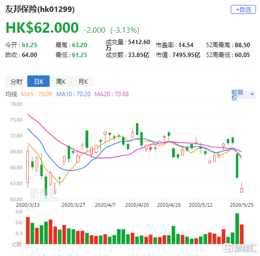 摩通发表研究报告指,友邦(1299.HK)上周五股价跌9%,跑输恒指跌6%的表现,目前股价相等于P/EV的1.4倍,估值处于历史低位,即使在香港离岸市场销售永久减少,以及今年内地新业务增长减慢的情况下,该行目标价亦只削10港元或11%,至81港元,较上周五收市价64港元仍有27%的上行空间,认为股价上行风险会较下行大,未来12个月的催化剂包括,在疫情后市民对保障需求提高、下半年香港的基数转低、内地市场全面开放的潜力。又认为友邦的企业价值,加上稳定的现金流,在中期而言表现强劲。该行维持公司目标价91港元,评级增持。