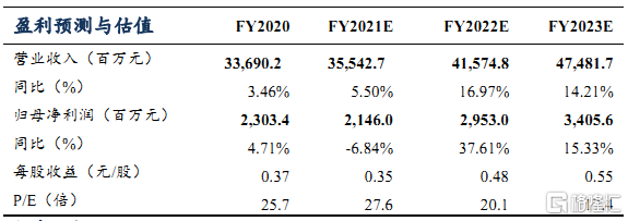 盈利能力稳健、营运效率维持高水准。财年内受益更严格的折扣控制公司毛利率提升 0.3pp至 42.1%;剔除上市费用及企业合并因素,营业利润33.90亿元(+3.3%)疫情影响下营业利润率仍达到同比持平; 归母净利 23.81亿元 (+6.5%) , 净利率 7.1%(+0.2pp) ,盈利能力持续提升;同时 2月末作为疫情影响最严重时期公司存货规模同比仅上升 8.3%至 66.5亿元,应收账款规模同比下降 41%至 14.9亿元,叠加应付款余额上行,带来营运资本增加,20财年经营性现金流同比增长 105%至 64亿元