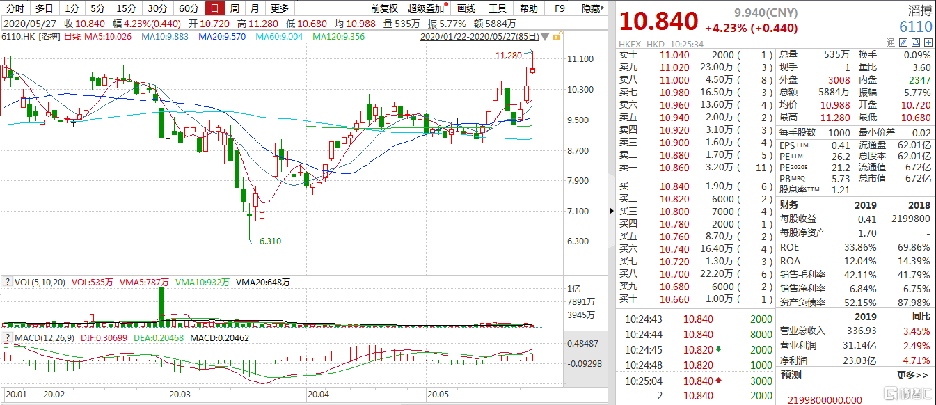 5月27日,滔搏(6110.HK)涨近超4%,连续第三日上涨,目前涨至10.84港元,股价有望挑战其上市以来高点11.28港元,最新总市值为672亿港元。