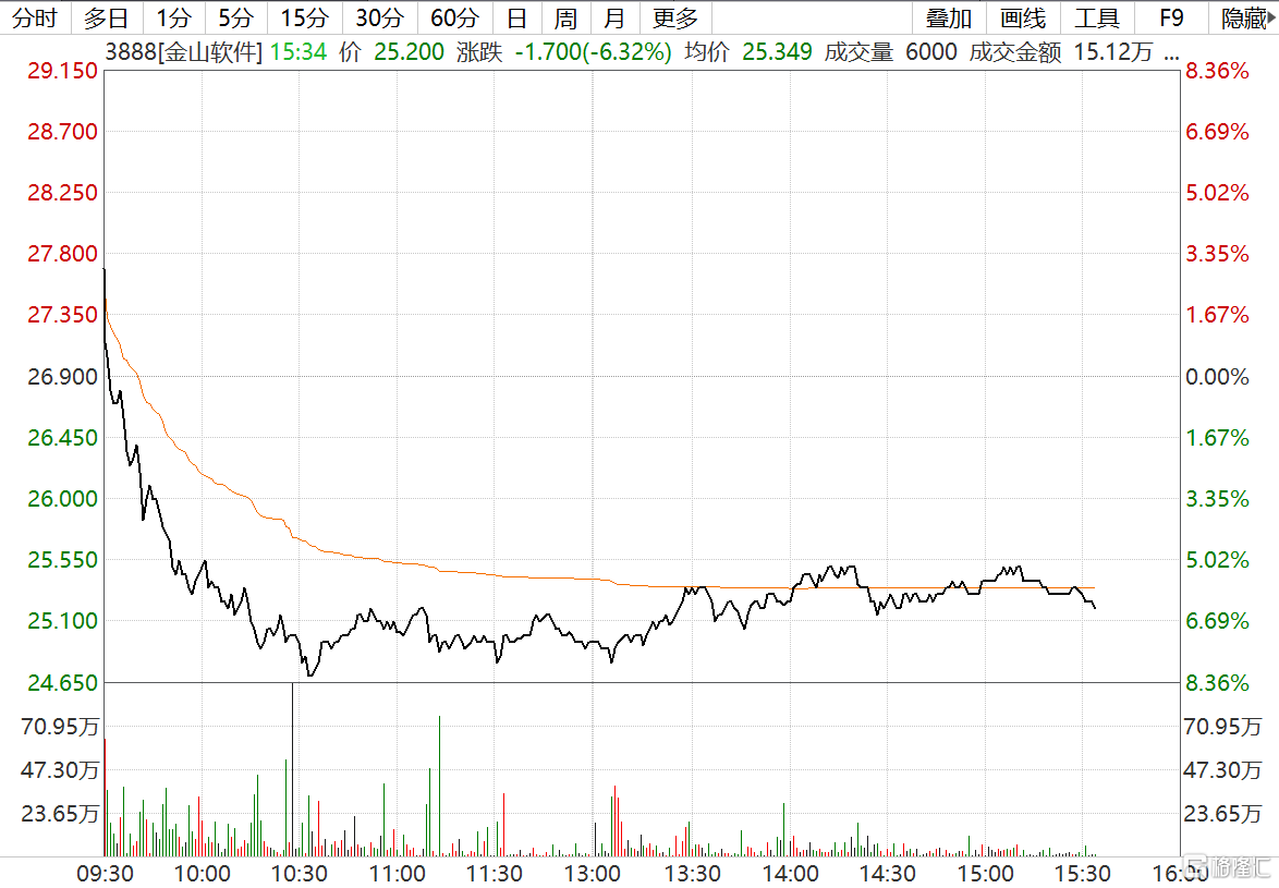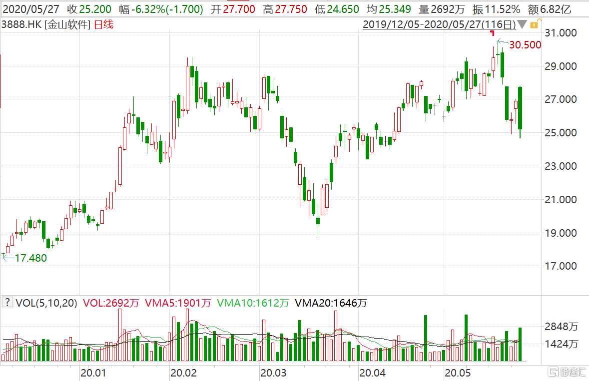 二级市场上,金山软件(3888.HK)今日高开低走,股价一度由高开近3%跳水下跌至超8%。现跌6.32%报25.2港元,暂成交6.8亿港元,最新总市值346亿港元。该股自3月19日低点18.76港元反弹至5月20日创出阶段新高30.5港元,期间2个月最大涨幅达62%;年内累涨幅度达26%。