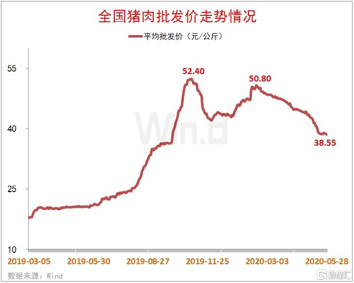 Wind梳理农业部数据显示,最新一期猪肉批发价报38.55元/公斤,较年内50.80元/公斤的高点,累计降幅已达24.11%,且还创出2019年9月30日以来新低
