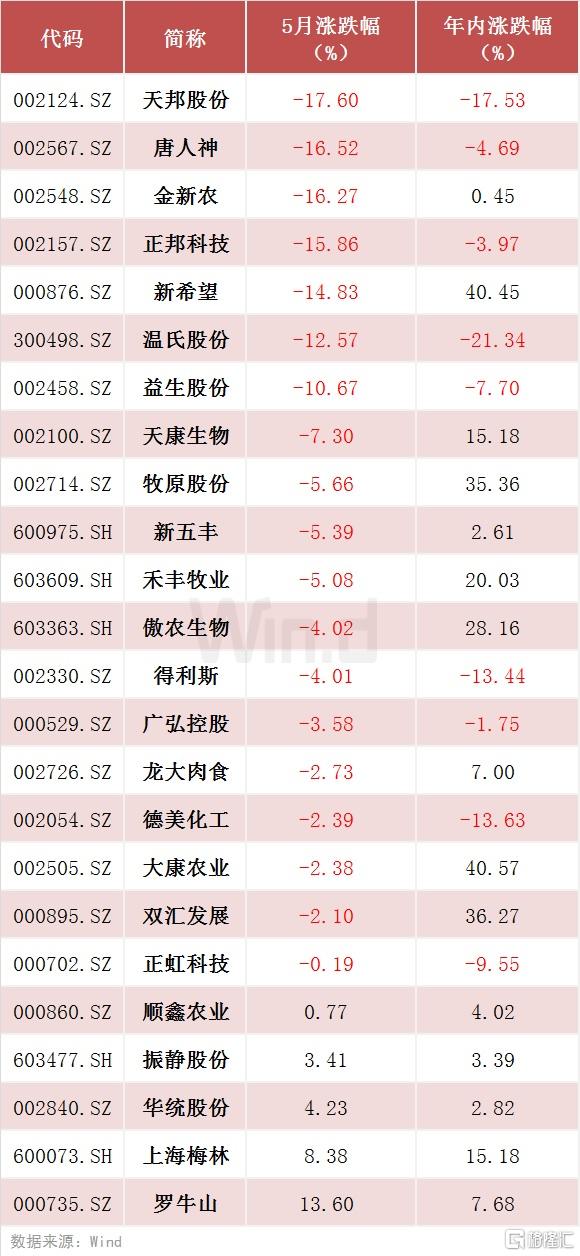 Wind数据统计显示,截至5月29日收盘,纳入统计的24只猪肉关联个股中,仅有5只个股月内飘红,其余个股悉数收绿。