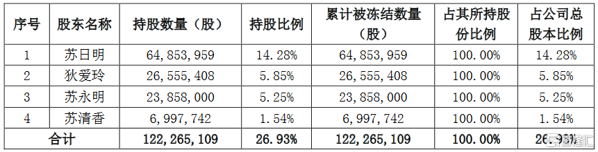 截至公告披露日,上述股东及其一致行动人所持股份累计被冻结情况如下: