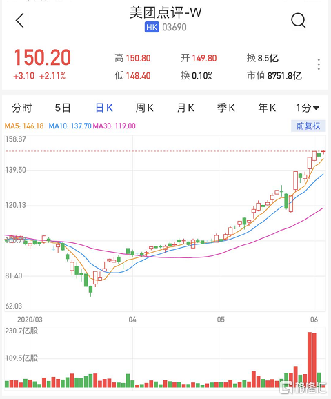 格隆汇6月3日丨美团点评(3690.HK)涨超2%,高见150.8港元再创上市新高,市值超过8750亿港元。