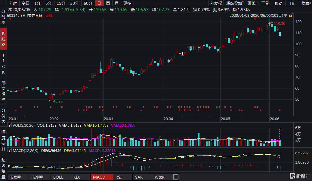 格隆汇6月5日丨安井食品(603345.SH)现报107.29元,跌幅4.91%,最新总市值254亿。公司昨日公告称,董事长刘鸣鸣拟最多减持400万股公司股份,约占公司总股本的1.6922%;董事兼总经理张清苗拟最多减持200万股,约占公司总股本的0.8461%。