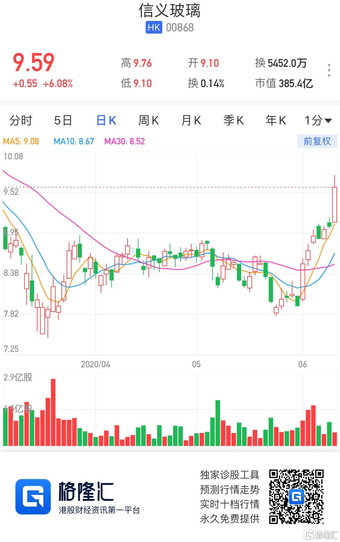 格隆汇6月9日丨信义玻璃(0868.HK)盘初一度急升超7%,现报9.59港元,涨6%,暂成交5452万港元,最新总市值385亿港元。信义玻璃发布盈警公告,截至2020年6月30日止6个月的股东应占盈利预期将减少25%至40%,由于卫生事件,导致本集团若干玻璃产品(例如汽车玻璃和浮法玻璃产品)的需求和平均售价下降。花旗表示,随着全球经济自5月以来逐渐重新开放,认为最坏时刻已经过去,公司中长期发展向好。中金公司指出,5月浮法玻璃需求改善迹象更加明显,在原料价格走弱背景下,浮法玻璃价格迎来反转。