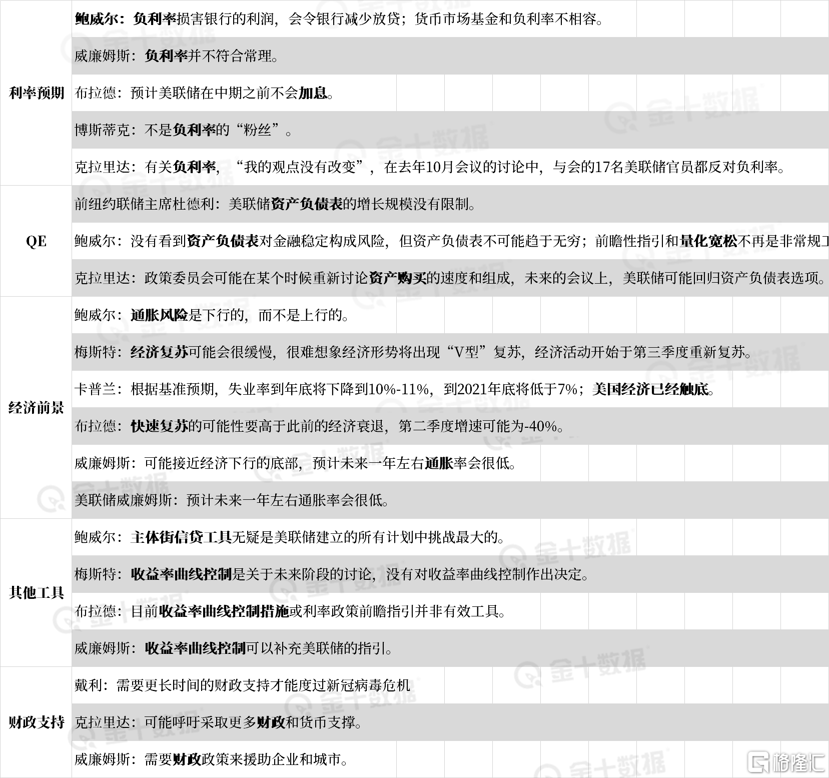 利率预期:几乎都反对负利率,同时否认短期内加息的可能。