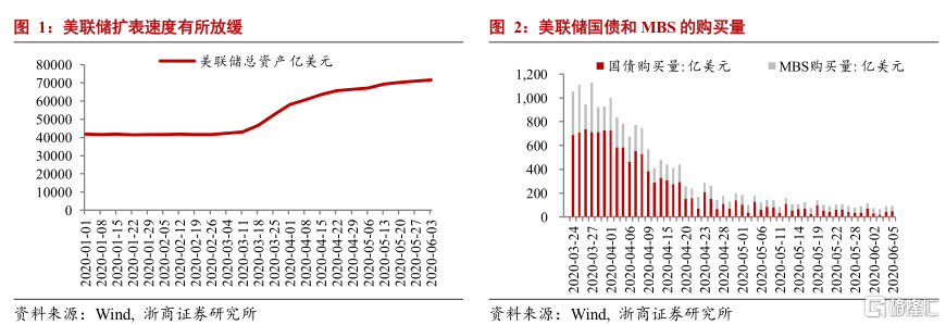 与4月声明相比,6月声明表示“金融状况有所改善”,而4月表述为“美国国内外遭遇的经济活动的扰动对金融状况产生了显著的影响,阻碍了对美国家庭和企业的信贷流动”,表明3月中旬以来的流动性冲击已过,与我们之前的判断一致。此外,6月声明表示“至少维持当前速度增持国债与MBS”,而4月声明则保证“会持续购买国债与MBS”,表明未来一个阶段美联储不会调降QE力度。
