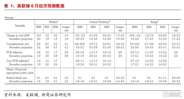 关于经济增长,美联储大幅下调了2020年的增速预测至-6.5%,但上调了2021年和2022年的经济增速中值分别至5.0%和3.5%,将中长期经济增速中值下调至1.8%。