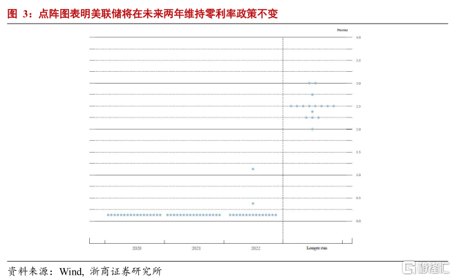 关于利率水平,2020年、2021年和2022年联邦基金利率预期中值均为0.1%。