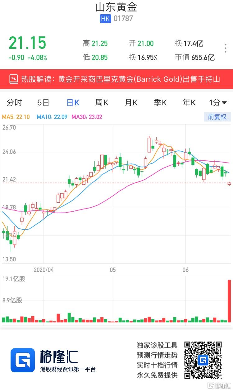 格隆汇6月17日丨山东黄金(1787.HK)现报21.15港元,跌4.08%,暂成交17.4亿港元,最新总市值655亿港元。据路透,加拿大黄金开采商巴里克黄金(Barrick Gold)出售手持山东黄金部分股权,共计7926.88万股,每股20.5港元,较昨日收盘价折价7.02%,套现16.25亿港元(2.1亿美元)。