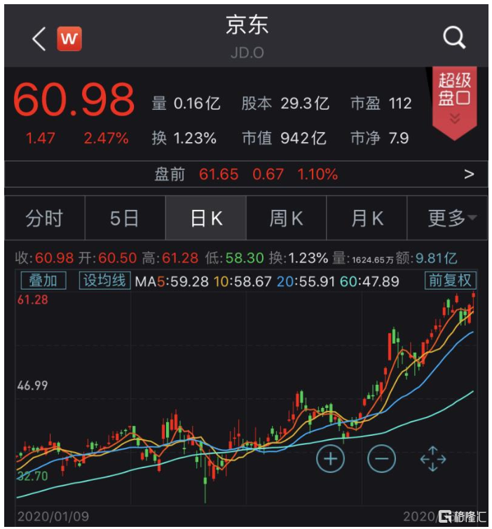 在美上市的京东,今年股价不断刷新历史记录,年初截止本周二收盘涨73.07%,总市值942亿美元。对比阿里上市周日涨幅6.59%,网易上市首日升5.69%,京东会涨多少?
